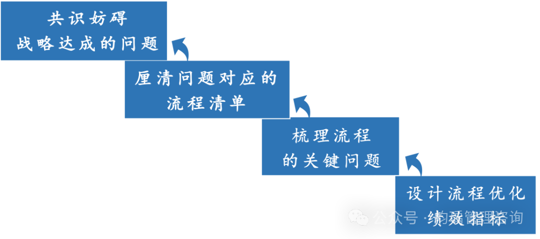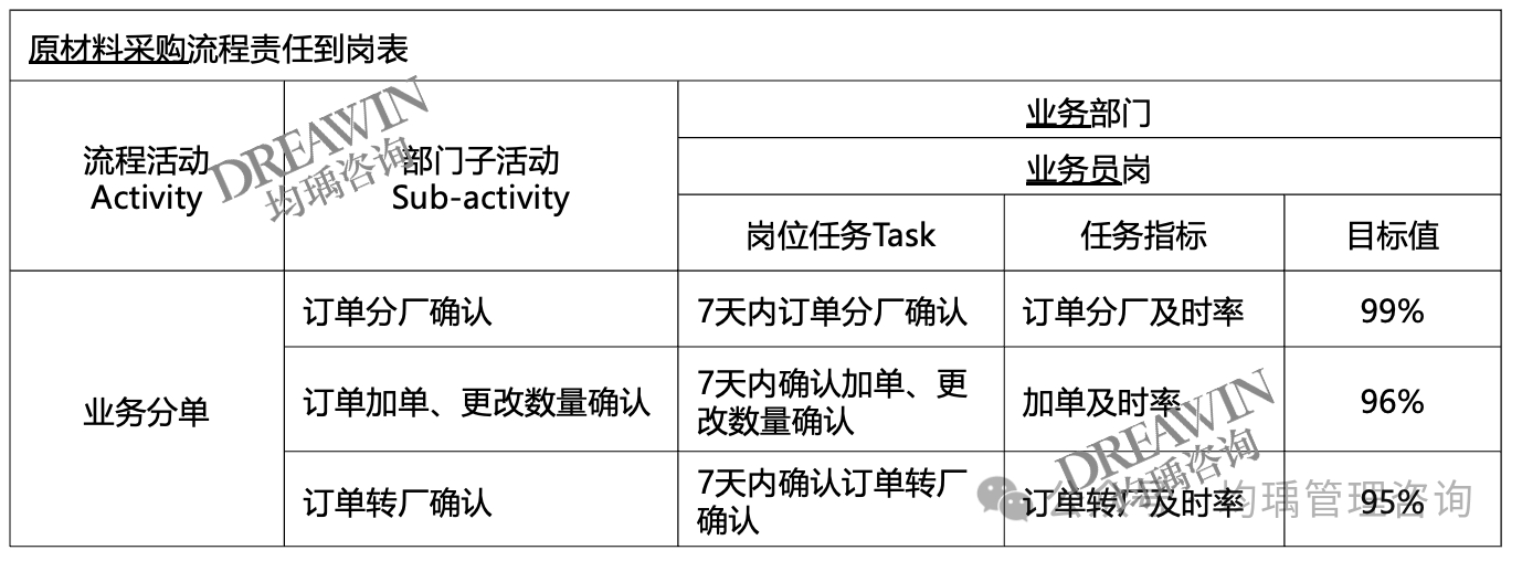 流程直接承接战略,流程目标直接承接战略目标。为了确保流程的成效,在设计、优化时,都要明确流程的目标,并将流程目标经流程活动,分解到部门指标、岗位指标。