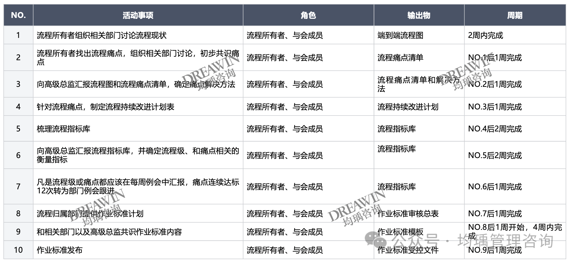 明确职责:流程清晰定义了每个人的职责和任务,减少了混乱。